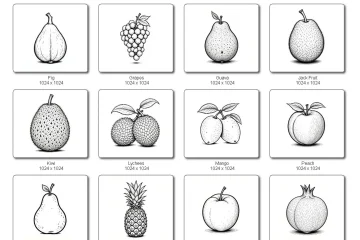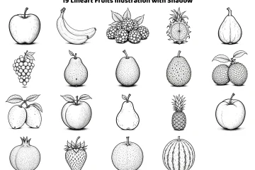 This pack includes 19 beautiful fruit line art illustrations with a clean black outline and a soft shadow at the bottom of each fruit. Each design is high-resolution and ready to use for printing, crafting, design, or digital projects.