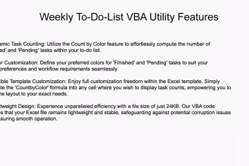 Introducing our highly customizable, lightweight Weekly To Do List VBA Utility. Seamlessly calculate task counts based on color using the CountbyColor formula, ensuring efficient task management.